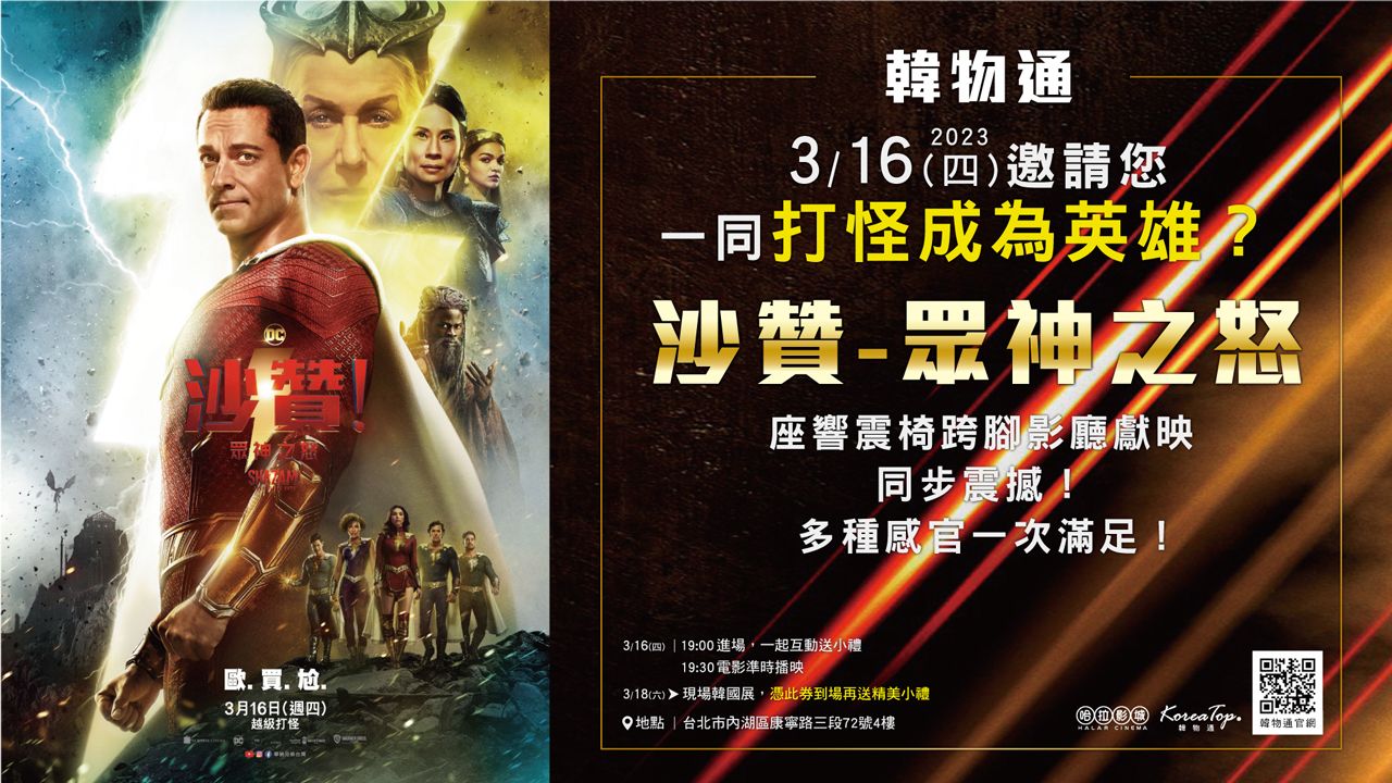 內湖哈拉影城舉辦的3/16特映會,結合了藝術、嗅覺等多重體驗,成為最夯、最時尚的活動,千萬不要錯過!韓物通Koreatop與影城聯合呈現了一場顛覆視覺、嗅覺、聽覺的派對,融合了《沙贊!眾神之怒》的特映會與知名主持人、藝人、網紅、設計師、直播主等多位嘉賓,讓觀眾一同體驗越級打怪的刺激!