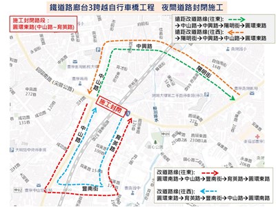 台中市政府建設局111年9月下旬啟動「鐵道路廊台3跨越自行車橋工程」,於豐原區圓環東路(台3線)與綠空廊道斷點新建自行車跨越橋,第一階段跨橋主梁結構吊裝及鎖固作業已提早於112年6月10日完成,第二階段跨橋面板吊裝施工將於112年6月19、20日兩日22時至早上6時進行,屆時將封閉圓環東路部分路段,包含育英路至中山路、台3線171K+050至171K+250,請用路人注意鄰近路口告示牌提早改道,並配合現場指揮人員導引通行。