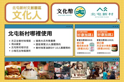台中市政府文化局表示,北屯新村麻雀雖小、五臟俱全,106年以促參方式委由兩果文化創意有限公司經營管理,規劃「故事館」、「方正谷眷村味」餐館、「大方男士理髮」、「小梅花老物販賣所」、「北屯新村柑仔店」、「飛冰菓室」等空間。即日起至8月6日於全園區使用文化幣消費滿500元,即贈送台中特產飲品「羅氏秋水茶」;消費滿1200元即贈送方正谷眷村味餐館「眷村豆豉小魚乾」。