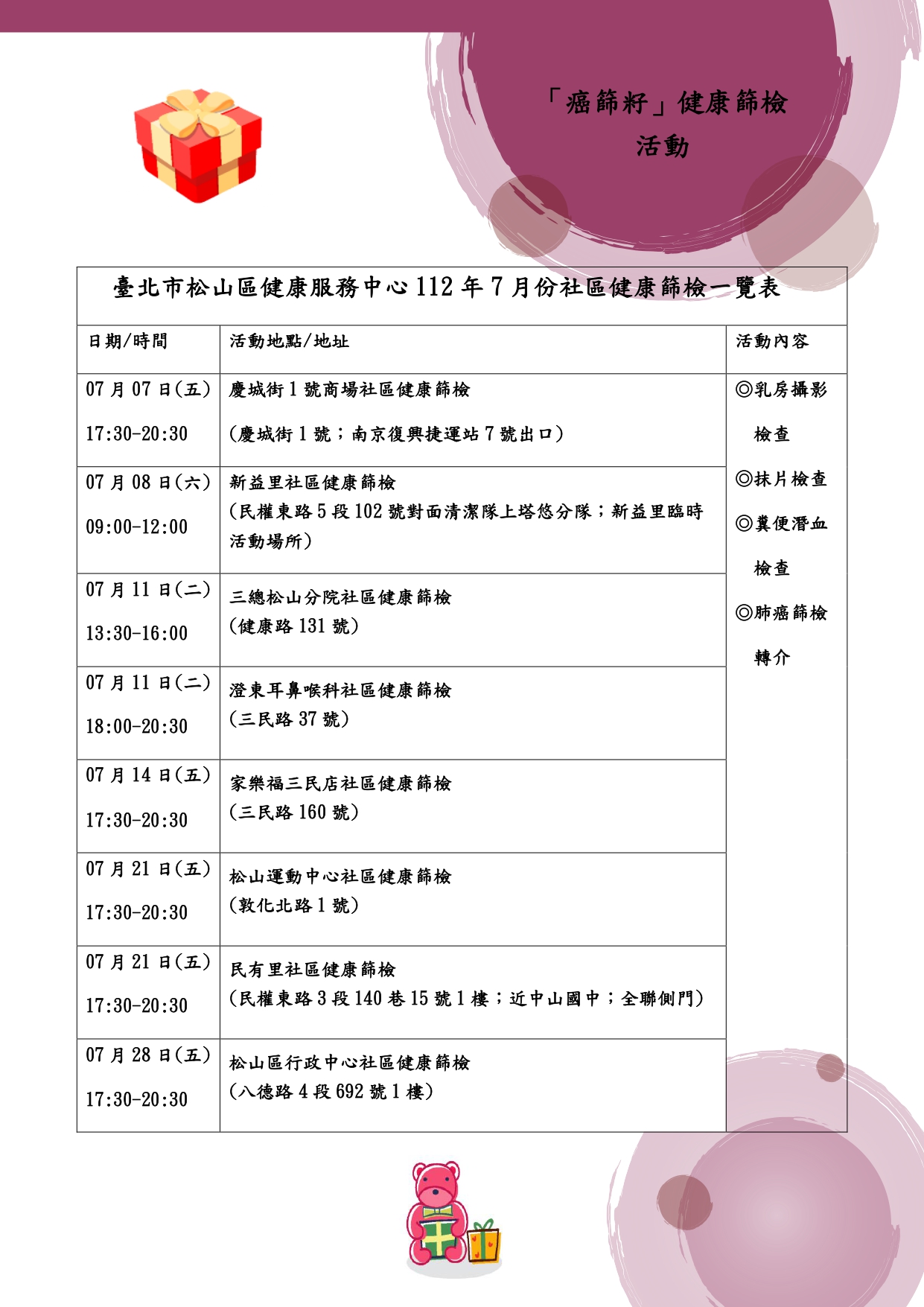 還沒癌症篩檢的民眾,卡緊來參加有保庇的「癌篩籽」活動!相關健康篩檢活動資訊詳見臺北市松山區健康服務中心網站或電洽02-27671757轉6038林護理師。