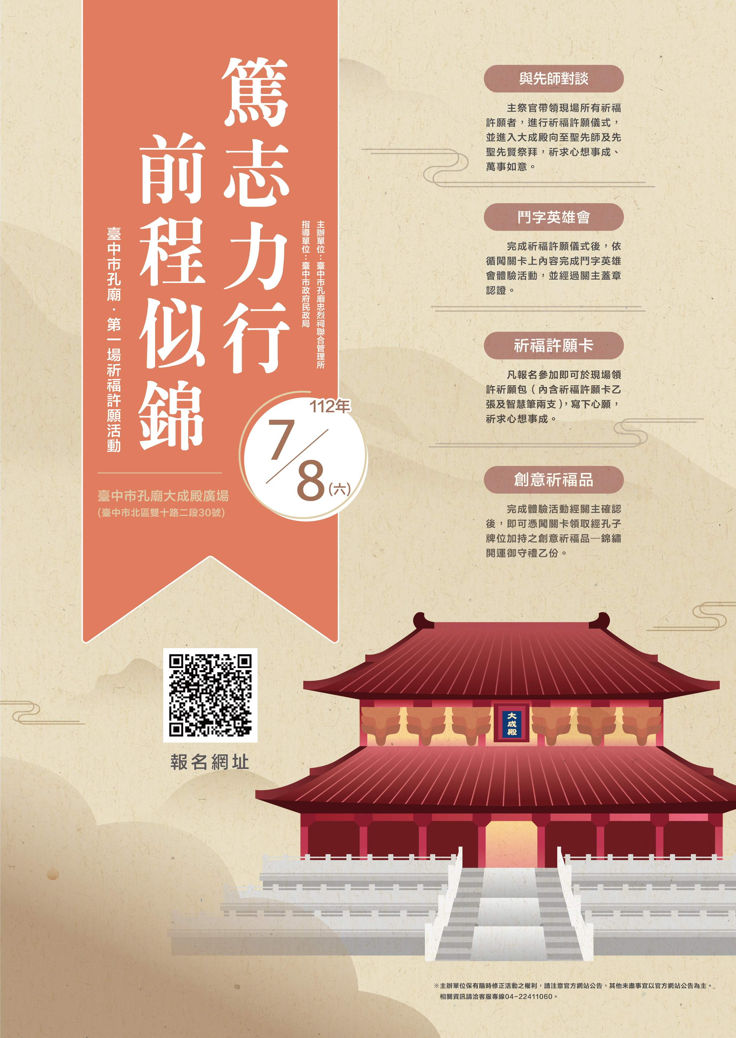 台中孔廟今年首場祈福許願活動「篤志力行、前程似錦」,7月8日上午9時將在孔廟大成殿廣場舉行,此次活動除傳統古禮祈福儀式,並結合「文字解題」闖關遊戲,體認文字結構的妙趣,完成闖關者,將可兌換經孔子加持的創意文創品「錦繡開運御守禮」,活動即日起至7月5日中午12時止開放網路、電話及現場臨櫃報名,活動當日上午也開放現場報名,名額有限,歡迎民眾踴躍報名參加。