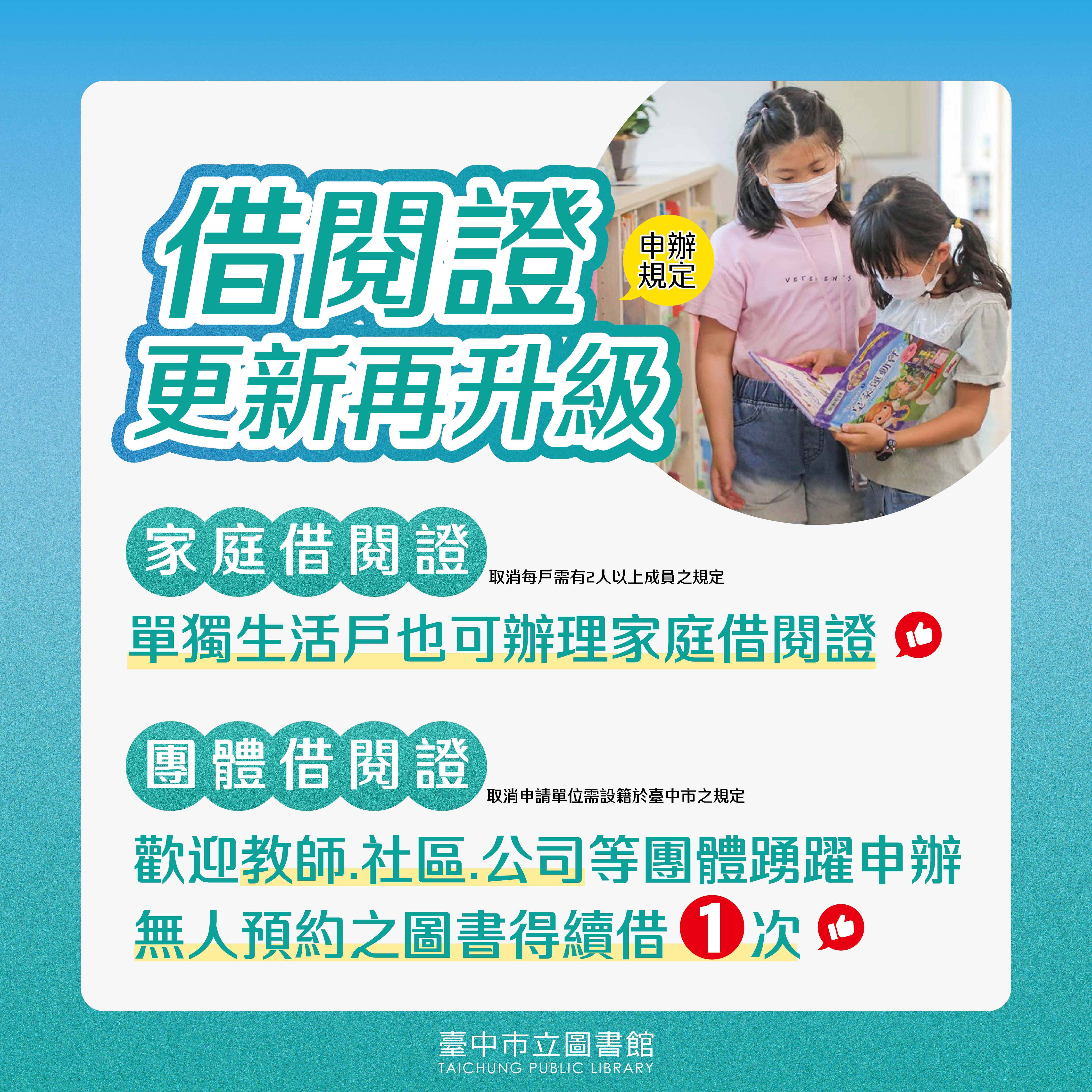 台中市政府文化局長陳佳君表示,市長盧秀燕上任後積極推動閱讀城市,台中市因氣候宜人、產業發展等優勢,獲國際認證為宜居城市,許多外地民眾在台中市就學、就業已形成共同生活圈;中市圖著眼民眾閱讀需求,調整家庭借閱證申辦條件,除無須設籍於台中市外,單獨生活戶也可申請,使用家庭借閱證最高可借閱60冊,再也不必擔心借閱額度已滿,將喜歡書籍一次借回家。