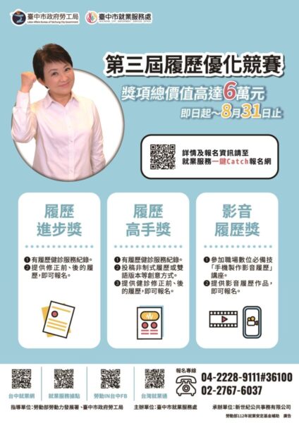 台中市就業服務處補充,第三屆履歷優化競賽活動資訊已公告,台中市凡有求職需求的市民朋友或求職者,皆可報名參加台中市履歷健診服務,履歷優化競賽受理報名至8月31日止,相關資訊請至「就業服務一鍵Catch 報名網(https://1catchjob.taichung.gov.tw/cont.aspx?act=2208)」查詢,或電洽04-22289111分機36100洽詢。
