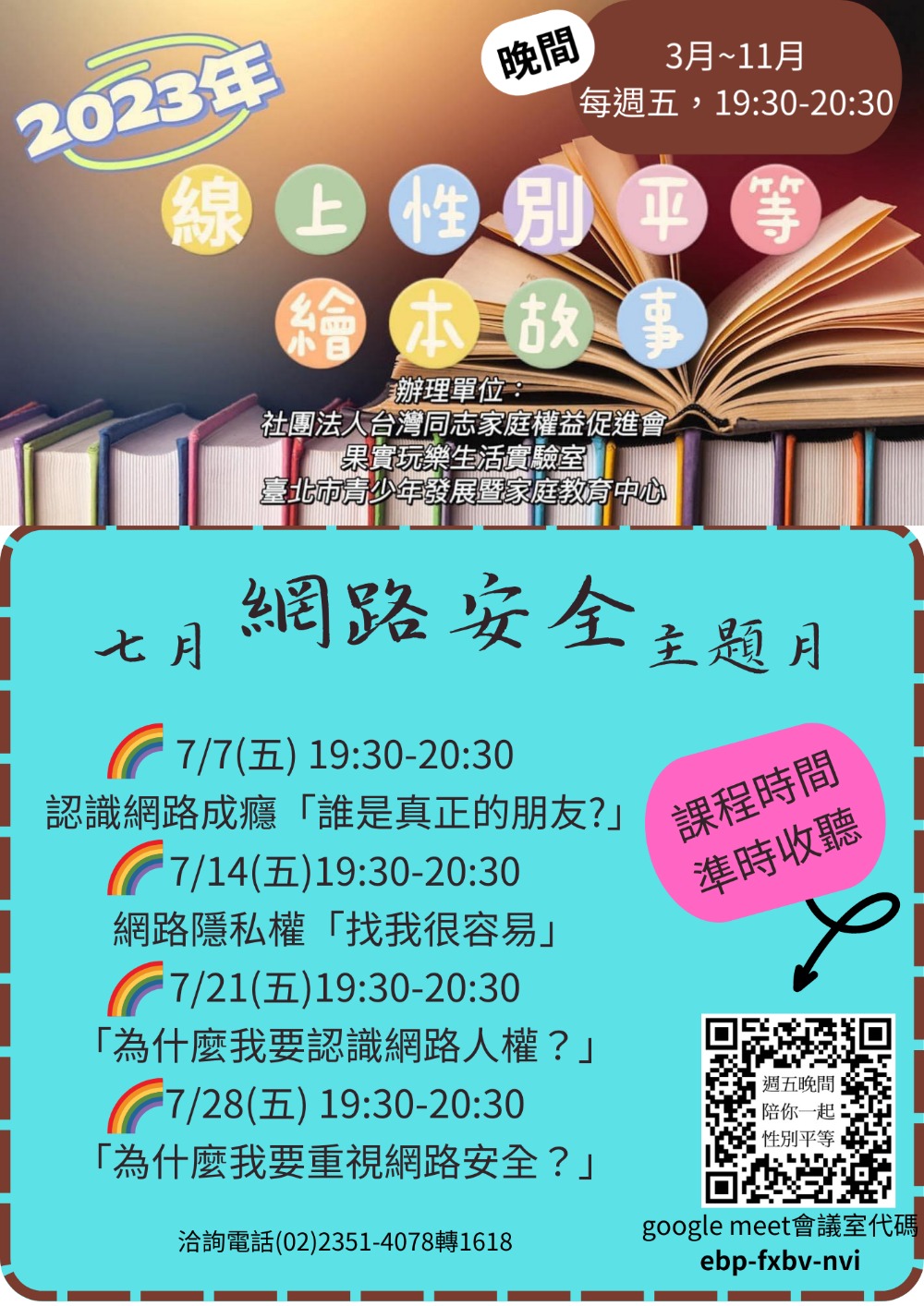 網路的發達,好似連結了我們生活的每一天,打開手機,社群軟體裡有好多各類社群的網友,一數就是數十位、數百位,但,現實生活中真正的好友有多少?您知道孩子的好朋友是誰嗎? 7月7日週五晚間,我們就要從「誰是真正的朋友」談起,跟大小朋友談談網路與人際關係的話題;接下來在7月14日、7月21日及7月28日,還分別要探討網路隱私權、網路人權和網路安全等主題內容。