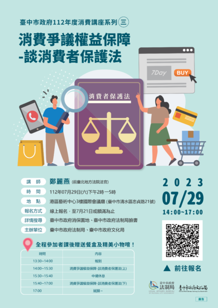 「餐廳吃壞肚子怎辦?」、「網購商品均有7日猶豫期嗎?」為讓市民瞭解消費者權益,台中市政府法制局與文化局邀請前台北地方法院法官鄭麗燕,於今年7月29日下午2至5時,在港區藝術文化中心3樓國際會議廳講談消費者保護法,歡迎市民朋友踴躍報名。