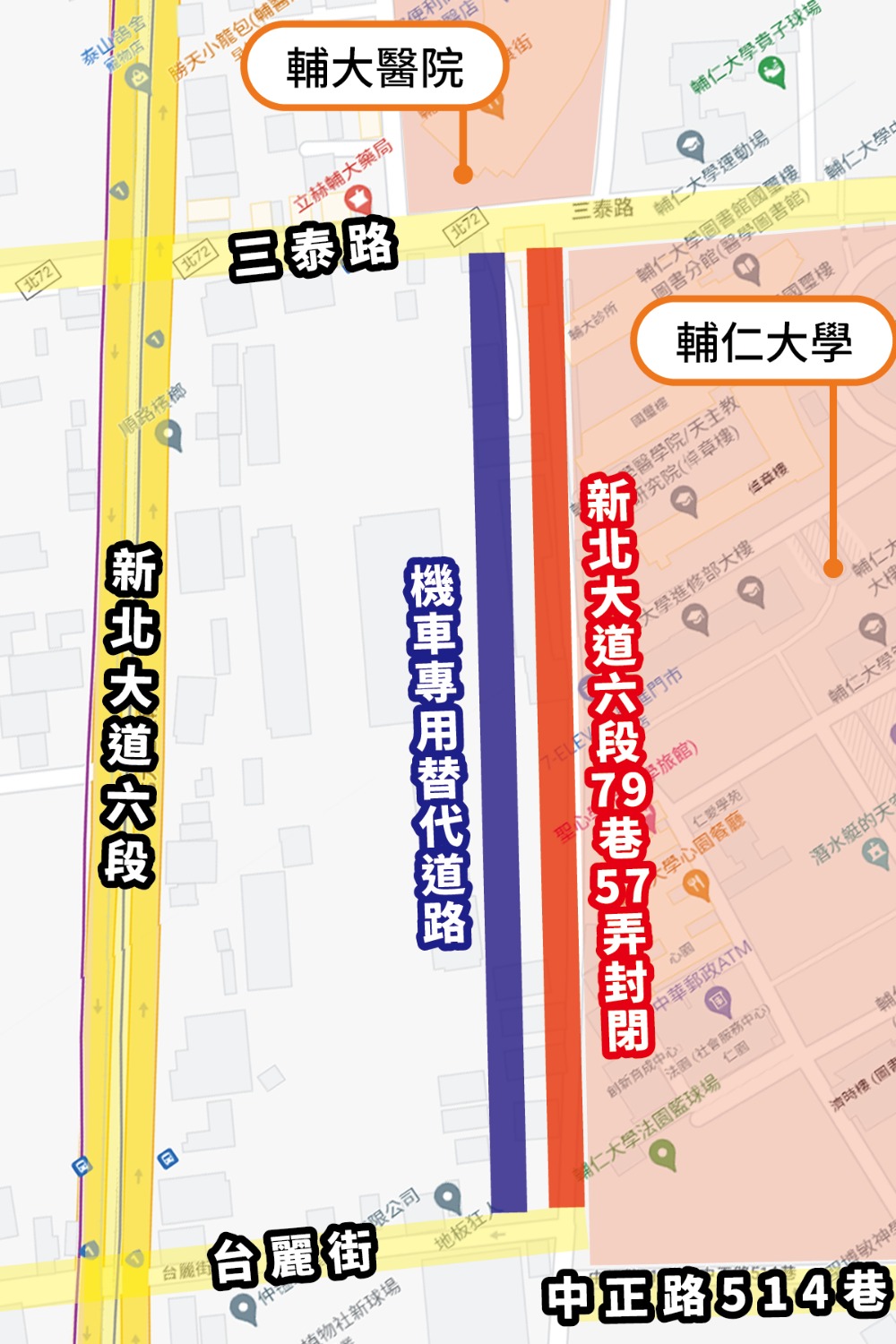 因應新泰塭仔圳市地重劃後,道路系統重新規劃,再加上工程施作必要,位於新莊輔大校園旁、被學生們稱之為「魔鬼巷」的新北大道六段79巷57弄,將在本月14日早上8時封閉,同時間啟用一旁新闢的替代道路,魔鬼巷正式宣告終結,還比原來多了一倍以上的機車停車位,提供輔大師生及輔大醫院就醫民眾免費停放機車。