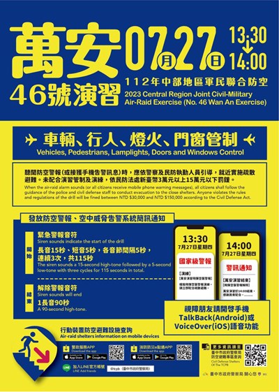 中部地區將於7月27日下午1時30分至2時實施萬安46號演習,台中捷運公司表示,演習期間捷運全線正常營運,下車旅客則請暫時停留車站,並配合車站人員引導於站內疏散避難;各捷運站附屬停車場也將進行管制,車輛只進不出。