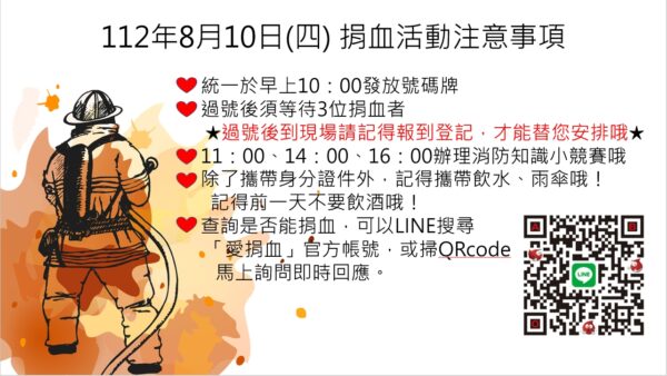 消防局提到,到時現場除挺身捐血活動,亦設立防火宣導站,當民眾通過各站任務,即能換取精美贈品;活動上午及下午更舉辦消防知識小競賽,通過小競賽的民眾,也能獲得消防精美禮品,活動中既能學習、又拿好禮,還能傳愛,心動不如馬上行動!