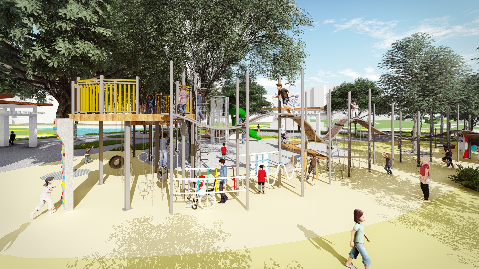 陳局長指出,建設團隊之前已辦理兩場次地方說明會及兒童參與式設計工作坊,聽取大家對於公園的改建意見,透過公私合作分階段改善園內景觀及遊戲設施。第二階段投入經費約3,850萬元,即將於今年9月進場施作,並預計於113年5月完工,包括整合既有遊戲場、親子設施及復古式爬架為「林間探索遊戲區」;同時改善主動線的無障礙通路、圖書館廣場及夜間照明,並將部分爬架移至池中島,營造為芬多精健身場,也以減法設計讓入口意象更為簡潔俐落,並且保有門戶時代意義。