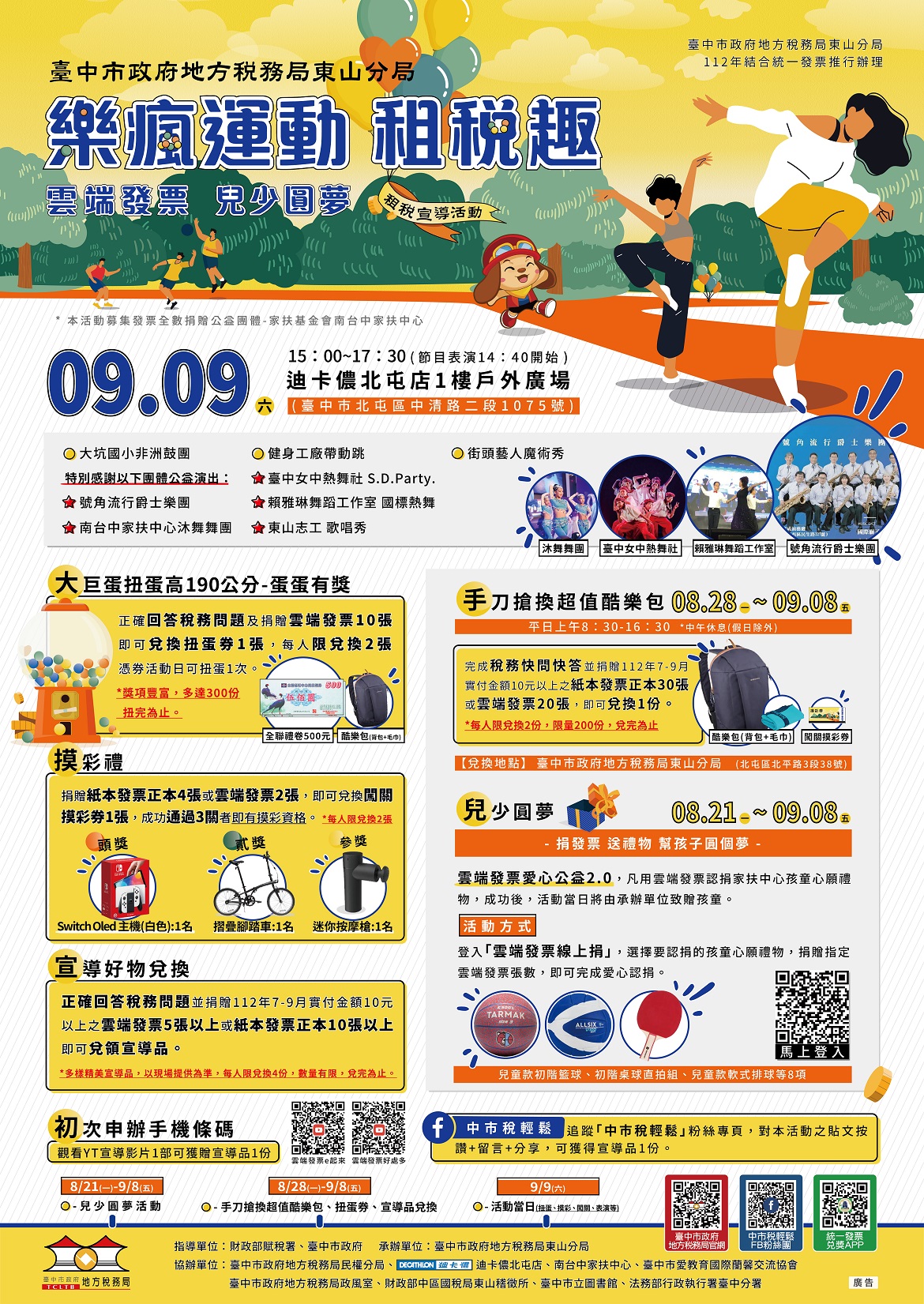 台中市政府地方稅務局東山分局將於9月9日下午3時至5時30分,在迪卡儂北屯店1樓戶外廣場舉辦「樂瘋運動 租稅趣」租稅宣導活動,邀請市民體驗大巨蛋扭蛋機、異國運動遊戲及魔術show,捐贈發票還有機會抽中Switch Oled主機等大獎,歡迎民眾踴躍參加。