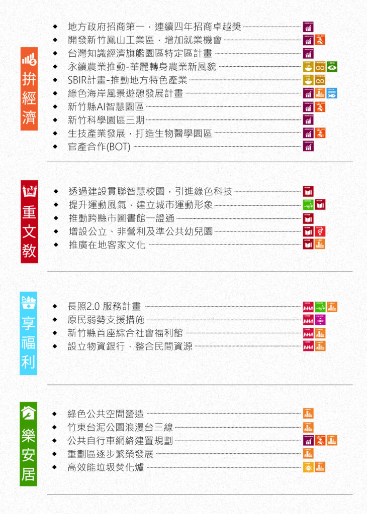 新竹縣參考聯合國「2030議程(Agenda 2030)」所提出之17項永續發展目標,加上本土化、在地化考量。完成編撰新竹縣2023年版「地方政府自願檢視報告(Voluntary Local Reviews,VLR)」,整體脈絡遵循楊文科縣長之「拚經濟」、「重文教」、「享福利」及「樂安居」四大施政主軸,並落實SDGs「不遺漏任何人」(Leaving No One Behind)的精神。報告共收錄了新竹縣154項永續政策,74項利害關係人議合與共融作為,以及69項短中長期永續發展目標。