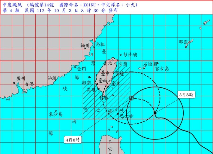 中度颱風小犬(國際命名KOINU)已於2日深夜發布海上颱風警報,中央氣象署指出,到了今(3)天8時,它的強度還有再增強,中心位置在北緯20.5度,東經125.1度,即在鵝鑾鼻的東南東方約460公里海面上,以每小時11公里速度,向西北轉西進行。若走向和速度未改變,氣象署將在中午前後發布陸警。