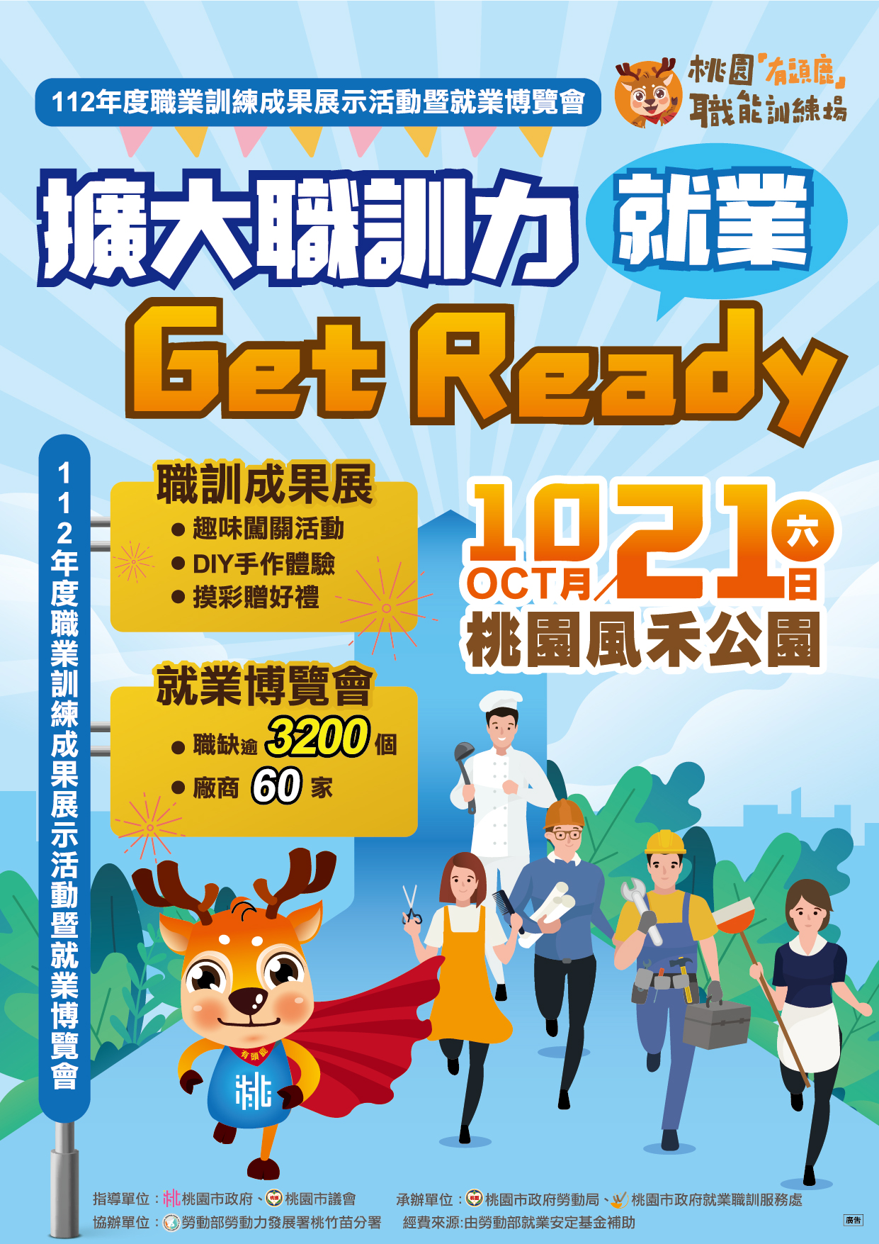 桃園市政府就業職訓服務處-桃園「有頭鹿」職能訓練場,為強化市民職業技能,培養專業學識,協助市民進入職場為成立宗旨,除自行規劃辦理職業訓練課程外,亦結合勞動部勞動力發展署桃竹苗分署、轄內各大專校院等單位資源,共同提供民眾多元職業訓練機會及就業服務,培植許多優秀的勞動力進入職場。為展現本市職訓成果,特於10月21日(星期六)舉辦「擴大職訓力 就業Get Ready」職訓成果展暨就業博覽會,希望透過動態、靜態展示讓民眾了解職業訓練的功能與重要性,歡迎民眾踴躍前往參加。