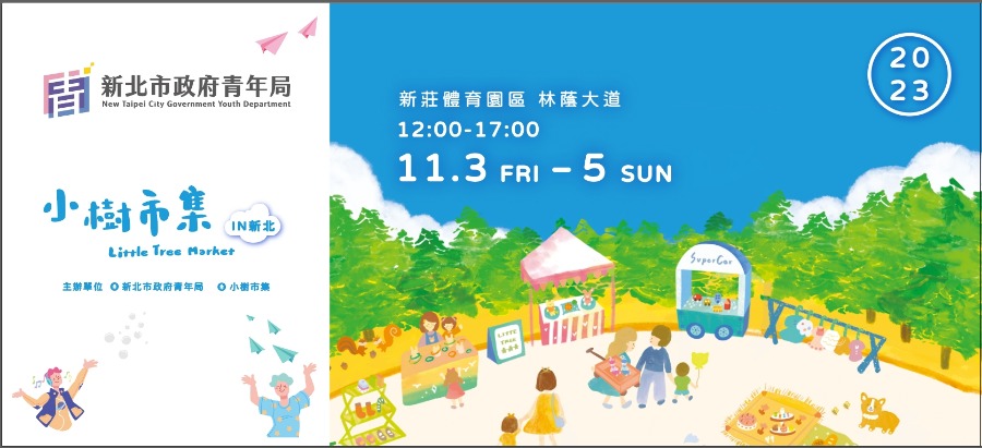 全臺規模最大親子二手市集「小樹市集」來新北了!新北市政府青年局再次和小樹市集合作,再度擴大規模,將於 11 月 3 日至 11 月 5 日連續三天在新莊體育園區舉行超過 800 攤位的「小樹市集 IN 新北」。活動當天將由 MOMO 家族的泡芙姊姊唱跳開場,還有知名 YouTuber 波蘭 Anna,以及 IKEA 宜家家居新莊店共襄盛舉。此外還有親子闖關活動、有獎徵答及華麗泡泡秀等活動,歡迎市民朋友一起到場同樂!
