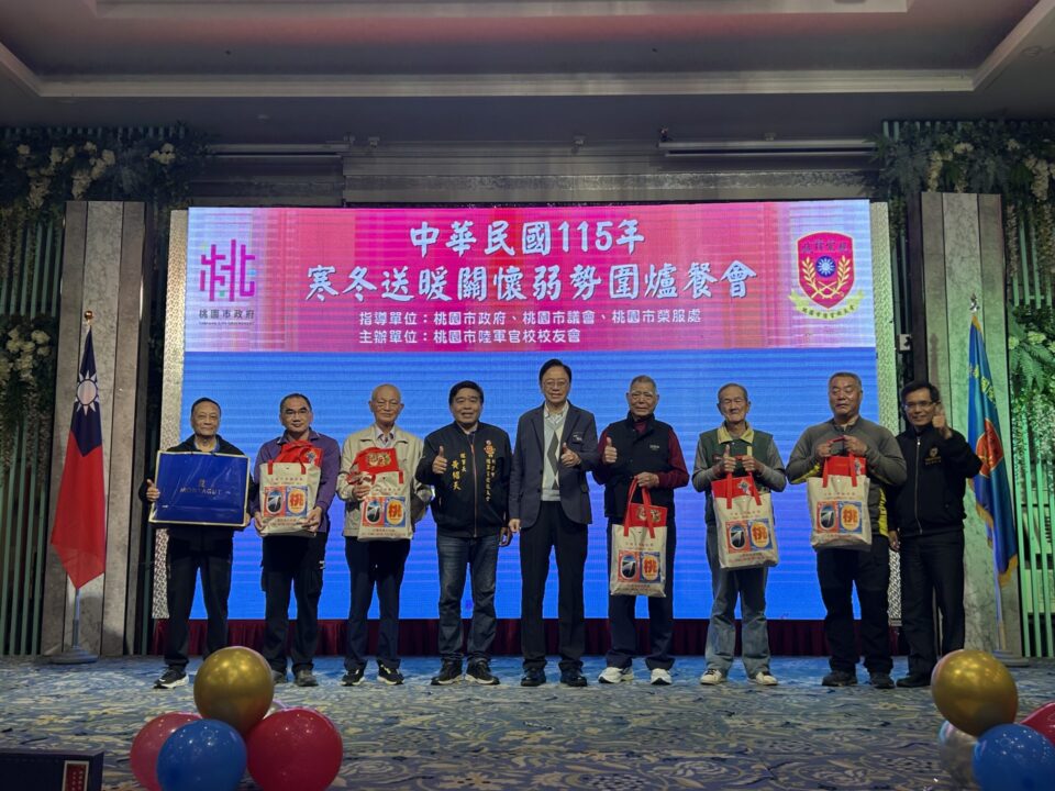 農曆春節將至,為讓高齡、獨居及生活困難的榮民眷感受到過年的溫暖,桃園市民政局聯合桃園市榮民服務處與桃園市陸軍官校校友會,於今(5)日在中壢綠光花園婚宴會館舉辦「寒冬送暖關懷弱勢圍爐餐會」。現場席開35桌,超過百人歡聚一堂,長輩們彼此寒暄互動,臉上洋溢幸福笑容,不少人表示已許久未曾在年節期間感受到如此熱鬧與溫暖的關懷。