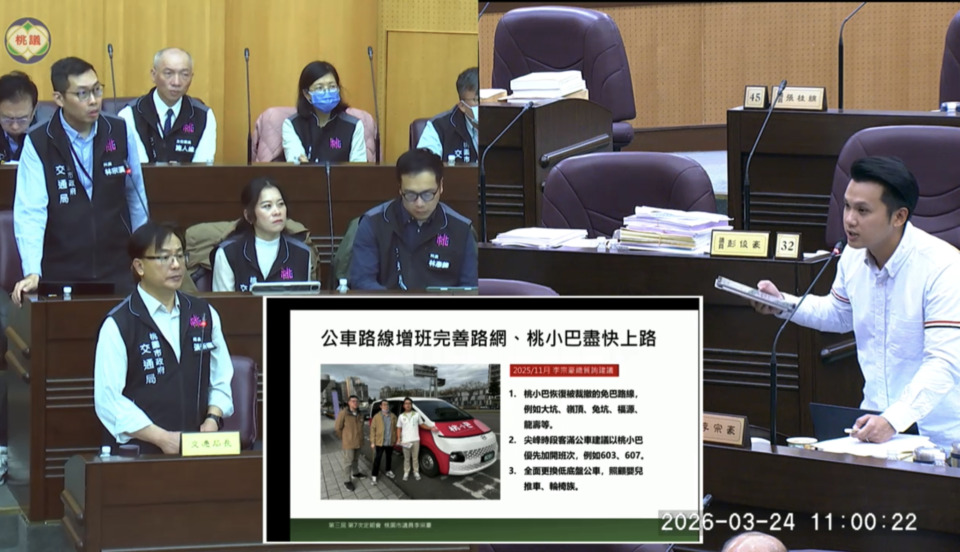 桃園市議會今(24)日進行交通局工作報告,民進黨籍市議員李宗豪針對龜山區公車運輸量能不足、國小學童通學安全、黑心拖吊業者、大型重機停放路邊機車格等議題提出質詢。首先,李宗豪指出,隨著龜山區人口快速成長,現有公車班次與路線明顯無法負荷,通勤壓力持續增加,建議以桃小巴紓解市民通勤需求。