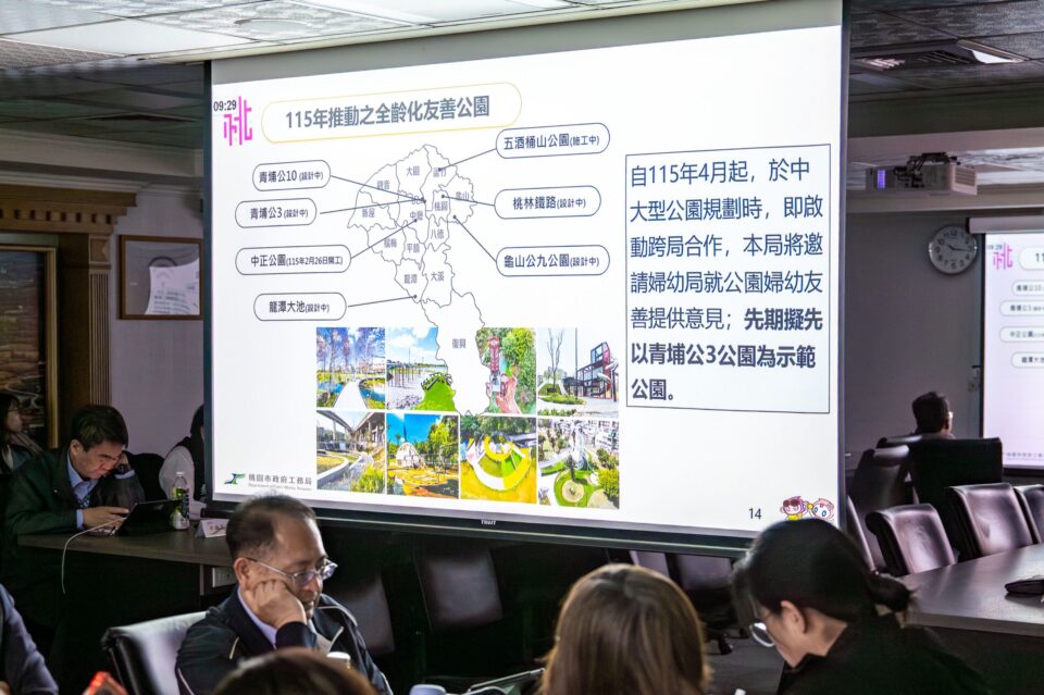 工務局指出,桃園近年持續推動特色公園及全齡友善空間,佈建8+5全齡特色共融公園,包括大湳森林公園、中壢中正公園、龜山公九、大坪頂公園及龍潭大池等案均穩健推進。未來將以青埔公三新建公園作為婦幼友善示範場域,導入親子、高齡及性別友善設施,打造兼具安全性與共融性的公園環境。
