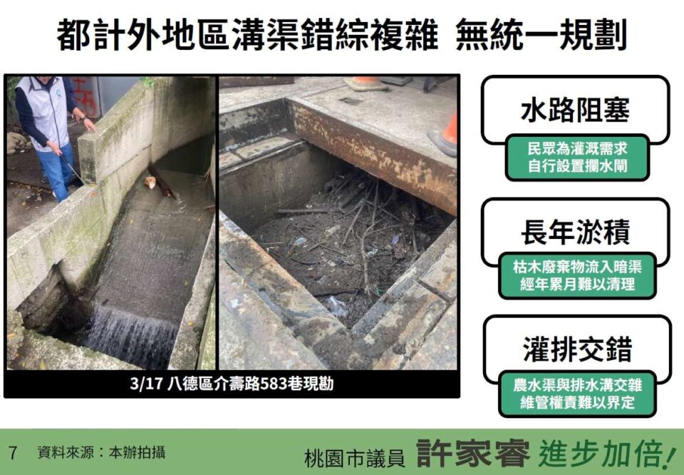 許家睿表示,八德都計區外有許多系統性的淹水問題,最常見的是舊灌溉渠缺乏維護造成阻塞淤積,灌排交錯狀況也造成許多爭議水路維管權責不清。另外許家睿以八德區廣福路為例,廣福路邊的長坡溪分洪道在大雨期間常有溢流到路面上的狀況,威脅用路人的行車安全。雖然目前已加高堤防避免溢流,但除了亡羊補牢,更重要的應是未雨綢繆,水務局應密切與都發局的鄉村地區整體規劃合作,主動盤點八德易淹水地區,提出長期且通盤的治水計畫,從根源上改善淹水狀況。