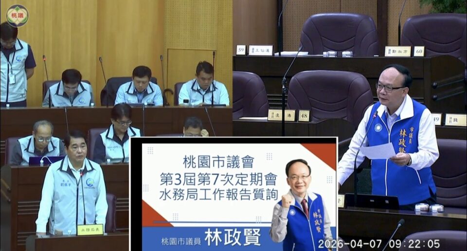 桃園市議會今(7)日進行水務局工作報告,市議員林政賢就桃園市公共污水下水道普及率、桃園市再生水資源、南崁溪下游段整治等議題提出質詢。