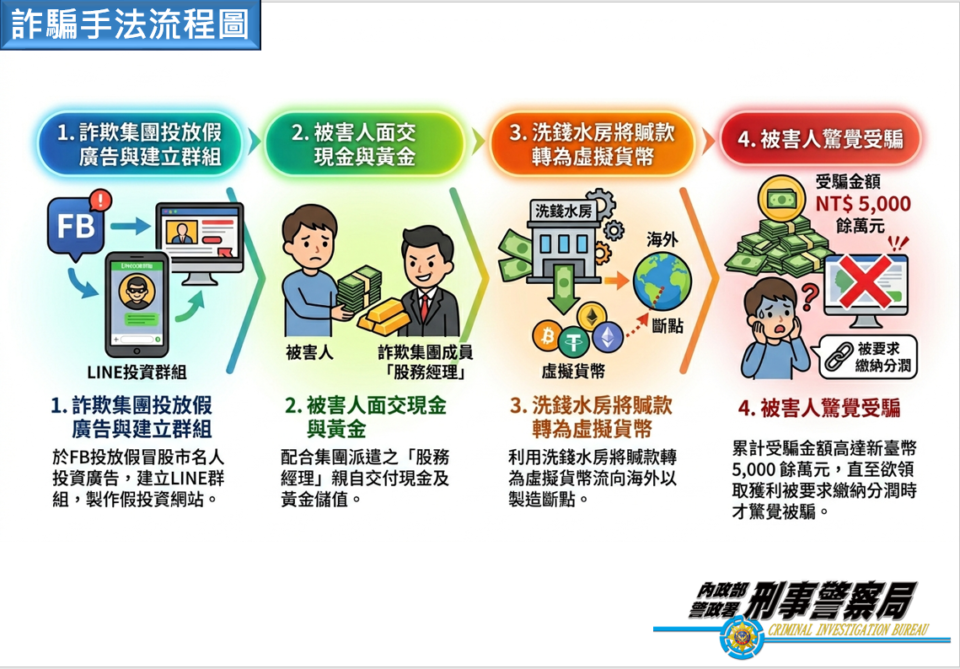 刑事警察局偵查第一大隊日前偵破一起假投資詐騙案,詐騙集團惡意冒用股市名人及大學教授名義,於臉書投放大量廣告誘騙民眾投資,一名被害人甚至抵押房地產投入資金,累計遭坑殺超過5000萬元。警方自去年9月起發動多波掃蕩,成功逮捕郭姓兄弟檔等21人,查扣保時捷、賓士豪車及名牌包等贓物。全案已依違反詐欺犯罪危害防制條例、洗錢防制法等罪嫌起訴,郭姓主嫌等4人遭羈押。